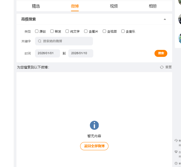 有些人的微博不支持搜索功能,如下,只能通过全部微博采集